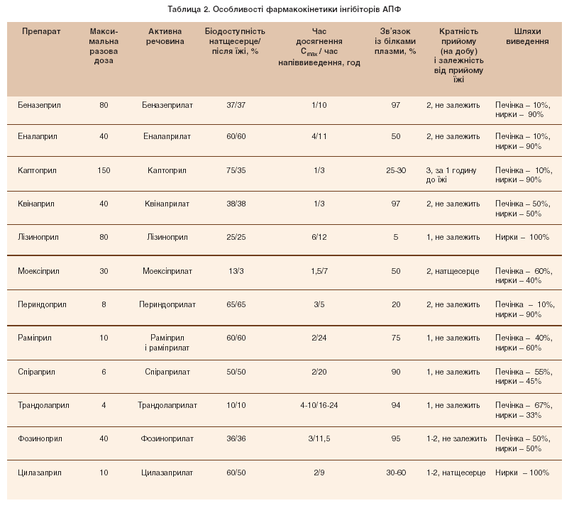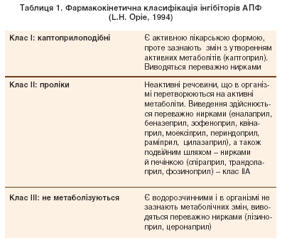 За фармакокінетикою інгібітори АПФ поділяють на дві групи (табл. 1). До першої входять первинно активні препарати (каптоприл і лізиноприл), до другої – неактивні речовини, що утворюють активні метаболіти (прилати) після трансформації в печінці і/або слизовій оболонці шлунково-кишкового тракту. Детальна характеристика основних фармакологічних властивостей різних інгібіторів АПФ наведена в таблиці 2.