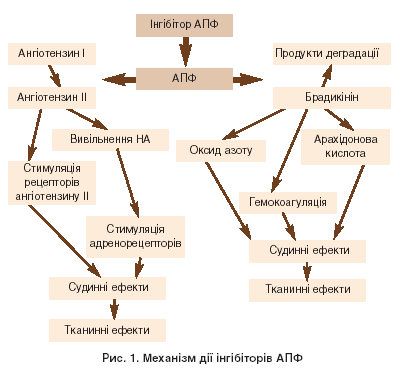 Механізм дії інгібіторів АПФ закладено в їх назві: блокада ферменту, необхідного для перетворення ангіотензину І (біологічно малоактивної речовини) в ангіотензин ІІ (ефекторний гормон РАС). Блокада РАС приводить до покращання тканинної перфузії, зменшення ремоделювання серця, зниження активності симпатико-адреналової системи. Крім того, інгібітори АПФ каталізують розпад брадикініну, підвищують його вміст, що сприяє вазодилататорним ефектом, покращанню функції ендотелію, активації тромболітичної активності крові. На жаль, дуже часто при поясненні механізму дії інгібіторів АПФ забувають про цю важливу сторону їх впливу. Сьогодні неможливо достовірно сказати, який з механізмів дії інгібіторів АПФ має більше значення для реалізації їх довгострокових клінічних ефектів.
