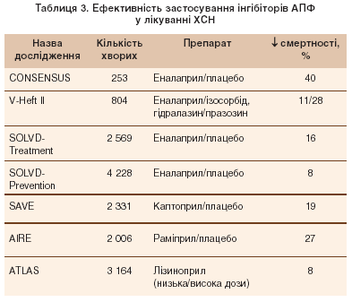 Протягом останнього десятиліття інгібітори АПФ стали золотим стандартом для лікування хворих із синдромом серцевої недостатності (дослідження CONSENSUS, Vet-HF-II, SOLVD-Treatment, ATLAS). Окрім того, у дослідженні SOLVD-Prevention було показано позитивний вплив еналаприлу на серцево-судинні кінцеві точки у хворих із безсимптомною дисфункцією лівого шлуночка, у тому числі із супутньою АГ. Таким чином, сьогодні інгібітори АПФ показані всім хворим із систолічною ХСН, незалежно від наявності клінічних симптомів. Тривалий прийом інгібіторів АПФ знижує смертність, сприяє зменшенню клінічної симптоматики, покращує переносимість фізичних навантажень, знижує ризик повторних госпіталізацій. У практичній діяльності необхідно застосовувати тільки ті препарати, ефективність яких доведена у клінічних дослідженнях (табл. 3). Разом із тим Рекомендації Української асоціації кардіологів (2006) також дозволяють застосовувати фозиноприл, периндоприл та квінаприл як препарати, що мають докази ефективності другого рівня. Лікування починають із мінімальних доз, але важливим компонентом успіху є досягнення цільових доз препарату для тривалого прийому.