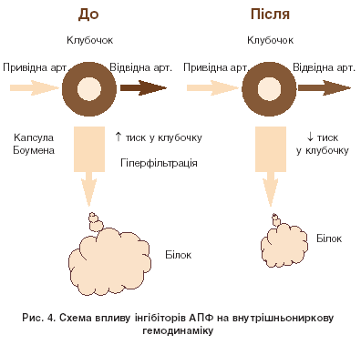 При хронічній патології нирок активація РАС є одним із провідних компонентів патогенезу захворювання. При цьому у значної частини таких хворих визначається нормальний або дещо знижений рівень активності реніну плазми, тоді як активність РАС у тканинах, у тому числі в нирках, підвищується в декілька разів. Разом із тим існують вагомі теоретичні аргументи на користь застосування інгібіторів АПФ для попередження прогресування ураження нирок у хворих на АГ. На думку експертів, важливим ефектом інгібіторів АПФ, що відіграє одну з ключових ролей у забезпеченні нефропротекції, є їх вплив на стан внутрішньониркової гемодинаміки. Схематично такий вплив зображено на рисунку 4. У лівій частині малюнка представлено типові зміни гемодинаміки у хворих на АГ, коли високий АТ передається на клубочкові артеріоли та виникає стабільна внутрішньоклубочкова гіпертензія, яка призводить до гіперфільтрації та продавлювання білка через мембрану під дією високого гідростатичного тиску. У правій – зміни внутрішньониркової гемодинаміки під впливом інгібіторів АПФ. Як і всі антигіпертензивні агенти, інгібітори АПФ викликають дилатацію привідної артерії, але, на відміну від інших класів препаратів, приводять до розширення відвідної артерії, що значно зменшує тиск крові всередині клубочка. Зниження гідростатичного тиску у клубочку сприяє значному зменшенню гіперфільтрації та зменшенню або припиненню протеїнурії.
