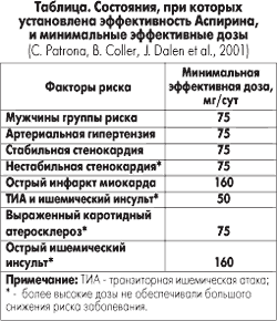 В настоящее время четко установлено, что при стабильной и нестабильной стенокардии, остром инфаркте миокарда, ишемическом инсульте и других состояниях эффективные профилактические дозы Аспирина составляют 50-160 мг/сут [3,4], причем во многих случаях увеличение дозы не приводило к повышению эффективности терапии. Состояния, при которых установлена эффективность Аспирина, и минимальные эффективные дозы приведены в таблице. Следует отметить, что антитромботическое действие Аспирина в низкой дозе нарастает постепенно, поэтому в тех случаях, когда необходимо добиться быстрого эффекта, например, при остром инфаркте миокарда лечение целесообразно начинать с более высокой дозы (162,5 мг/сут). Таким образом, с точки зрения клинической эффективности снижение дозы Аспирина оказалось оправданным.