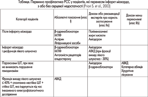 Результати дослідження MADIT-II свідчать про те, що значній кількості пацієнтів з ІХС і вираженою дисфункцією ЛШ слід проводити специфічну первинну профілактику РСС. Наприклад, у США зареєстровано принаймні понад 3 млн. пацієнтів з постінфарктною систолічною дисфункцією ЛШ, щороку виникають 400 000 нових випадків. На цей час економічно найдоцільнішим шляхом специфічної профілактики РСС у таких пацієнтів залишається застосування аміодарону (Кордарону). За відсутності протипоказань цей препарат слід поєднувати з b-адреноблокаторами, які підсилюють ефективність профілактики життєво небезпечних порушень серцевого ритму.