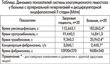 У больных с ДЭ II стадии на фоне умеренной АГ наблюдали характерную общемозговую и очаговую симптоматику. В клинической картине заболевания наиболее часто регистрировались синдромы пирамидной недостаточности (100% пациентов), вегетативной дистонии (100%), астено-невротический (80%) и ликворно-дистензионный (50%). При этом у 8 больных (40%) отмечали вегето-сосудистые пароксизмы симпато-адреналового типа. У пациентов с АГ и ДЭ выявлены достоверные гипокоагуляционные изменения по сравнению с группой здоровых людей аналогичного возраста и пола: удлинение времени рекальцификации на 47%, тромбинового времени в 2,8 раза, снижение концентрации фибриногена на 22% (табл.). Величина систолического АД у больных составила 165,2±3,5 мм рт. ст., диастолического АД — 103,8±2,0 мм рт. ст.