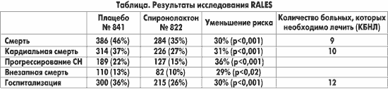 Исследование RALES убедительно доказало, что блокада альдостерона имеет большое значение в лечении СН, даже у больных, принимающих ингибиторы АПФ. Очень важно, что частота смерти от прогрессирующей СН и частота внезапной смерти были снижены при помощи старого, хорошо знакомого и недорогого препарата. Это исследование способствовало интенсификации исследований по изучению механизмов, благодаря которым блокада альдостерона приводит к улучшению течения СН, к более широкому применению спиронолактона у больных с СН. Основные результаты исследования RALES представлены в таблице.