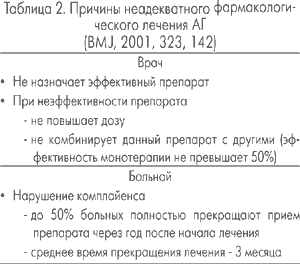 Наиболее частые причины неадекватного лечения АГ со стороны врача и больного представлены в таблице 2.