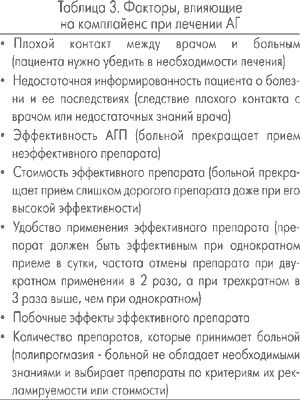 Комплайенс (строгое выполнение больным рекомендаций врача) имеет важнейшее значение при лечении АГ, так как оно должно быть пожизненным. Нарушения комплайенса: отказ больного от лечения, прекращение приема препарата, уменьшение его дозы приводят к снижению или к отсутствию эффекта от лечения. На комплайенс влияют следующие факторы (табл. 3).