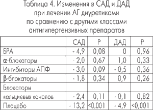 В этом метаанализе также показано, что лечение препаратами разных классов приводит к незначительной, недостоверной разнице в снижении АД по сравнению с диуретиками (табл. 4; K. Wolf-Maier с соавт., 2003).