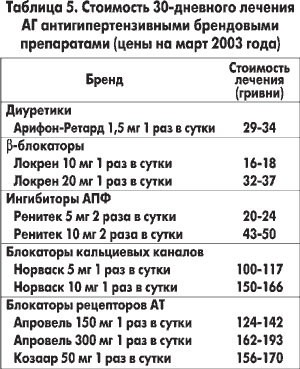 Давайте и мы посчитаем, во что обходится больному лечение АГ в Украине? Стоимость антигипертензивных брендовых препаратов в аптеках Украины представлена в таблице 5.