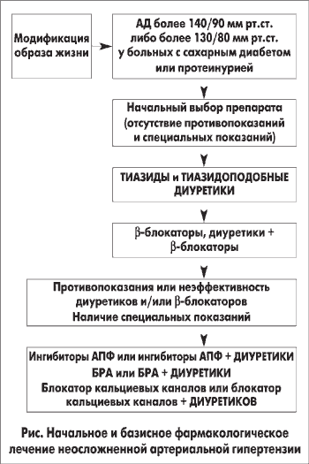 Тиазиды и тиазидоподобные диуретики, β-блокаторы или комбинация β-блокаторов с тиазидоподобными диуретиками должны быть препаратами выбора для начальной и базисной терапии неосложненной АГ. Ингибиторы АПФ, БРА, блокаторы кальциевых каналов или комбинация ингибиторов АПФ, БРА, блокаторов кальциевых каналов с тиазидоподобными диуретиками — возможная альтернатива, особенно при наличии специальных показаний, то есть должны быть лечением второго плана (рис.).