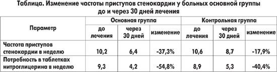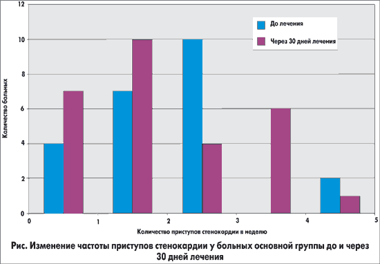 При выполнении нагрузочной пробы через 30 дней лечения у 9 пациентов основной группы отмечалось улучшение клинической симптоматики в виде уменьшения одышки, уменьшения интенсивности давящей боли в сердце, что позволило данным пациентам выполнить следующую ступень протокола Brus. В контрольной группе выполнить следующую ступень нагрузки смогли 2 пациента. У этих больных через 30 дней лечения среднее количество приступов стенокардии снизилось и оставалось на таком уровне до конца наблюдения. Клинически у этих больных изменился функциональный класс стенокардии с III до II.