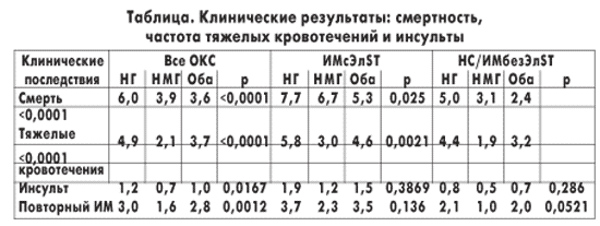 Госпитальная смертность для всей группы пациентов с ОKС и в подгруппе НС/ИМбезЭлST была существенно ниже при использовании НМГ или комбинации НМГ с НГ, чем при использовании одного НГ. Это отличие является значимым как для подгруппы ИМсЭлST, так и НС/ИМбезЭлST после коррекции по клиническим переменным, регистрируемым в исследовании GRACE. Общая частота тяжелых кровотечений и инсульта была существенно ниже при использовании НМГ, чем НГ.