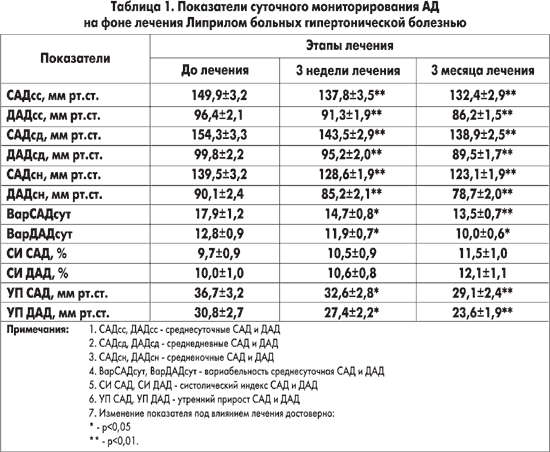 Таким образом, Липрил является эффективным антигипертензивным препаратом, прием которого через 3 недели монотерапии позволил достичь эффективного снижения АД у 71,9% больных ГБ с мягкой и умеренной АГ, в том числе его нормализации у 40,6% больных. Дополнительное назначение гидрохлортиазида способствовало увеличению антигипертензивного эффекта лечения. Длительный прием Липрила приводил к снижению как «офисного» АД, так и среднесуточных, среднедневных и средненочных значений САД и ДАД, а также к уменьшению вариабельности, утреннего прироста и скорости утреннего прироста АД, нормализации суточного ритма АД у большинства пациентов с его исходными нарушениями. Трехмесячное лечение Липрилом (и его комбинацией с гидрохлортиазидом) способствовало регрессии ГЛЖ. При этом показатели насосной функции миокарда ЛЖ существенно не изменялись.