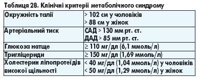 Метаболічний синдром – це поєднання факторів серцево-судинного ризику, а саме артеріальної гіпертензії, абдомінального ожиріння, дисліпідемії та інсулінорезистентності. Критерієм визначення метаболічного синдрому відповідно до рекомендації Національного інституту здоров’я США від 2001 року є наявність трьох або більше факторів, наведених у таблиці 28.