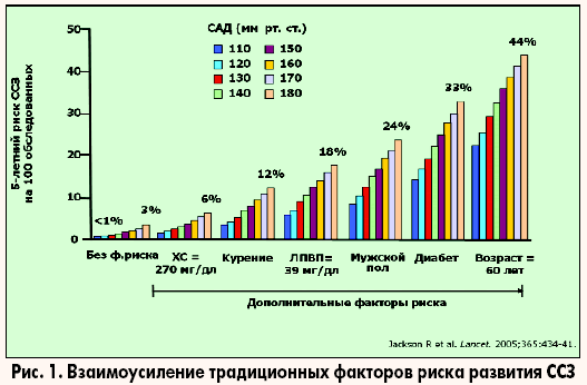 – На конгрессе в Барселоне большое внимание уделялось значению мультифакторного воздействия на большинство известных предикторов сердечно-сосудистого риска, ведь известно, что они не просто суммируются, а взаимопотенцируют друг друга (рис. 1). Принцип многофакторности терапевтических подходов находит свое отражение в новых рекомендательных документах. Например, в методических рекомендациях Европейского общества кардиологов по диагностике и лечению стабильной стенокардии 2006 г. четко отражена концепция системного подхода к ведению больных. Алгоритм делится на три этапа: