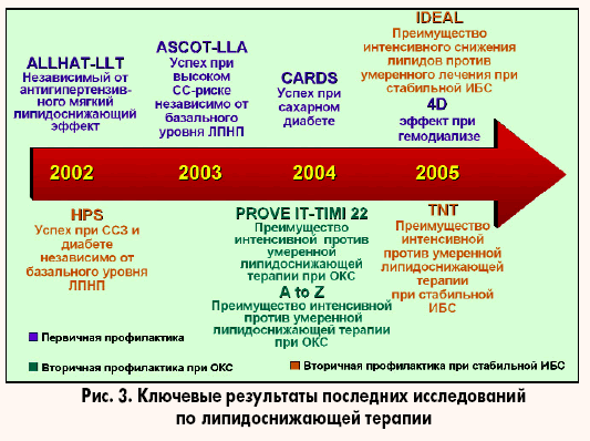 Липидоснижающая терапия должна занять свое место в этом алгоритме, а главное, в сознании врача и пациента, исходя из результатов исследований, проведенных за последние годы (рис. 3). Современный взгляд ведущих кардиологов мира на проблему множественных факторов риска можно представить цитатой специалиста мирового уровня по АГ N.M.Kaplan: «Будущее медикаментозной терапии принадлежит предупреждению осложнений и интенсивному устранению всего множества сердечно-сосудистых факторов риска, в частности гипертензии и дислипидемии».