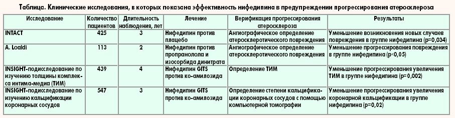 Таким образом, на настоящий момент результаты многочисленных исследований свидетельствуют о том, что нифедипин обладает способностью замедлять атеросклеротический процесс.
