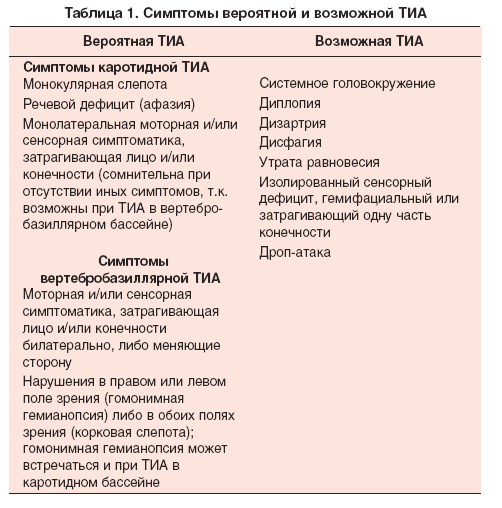 Манифестации ТИА можно классифицировать на две группы: симптомы вероятной и возможной ТИА (табл. 1).