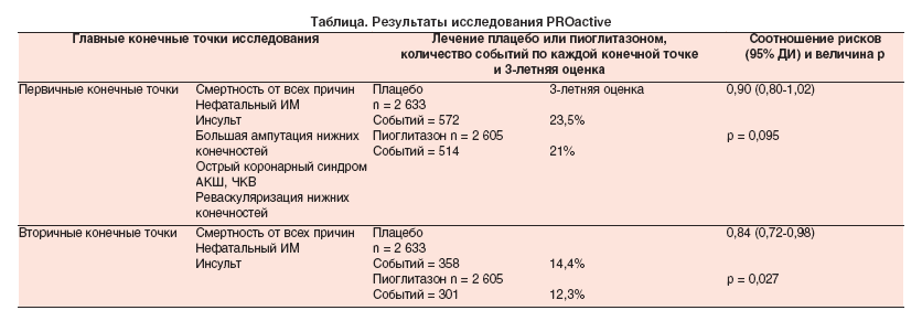 Исследование PROactive было посвящено изучению эффективности пиоглитазона при вторичной профилактике макрососудистых событий у больных с СД 2 типа. PROactive представляло собой рандомизированное контролируемое плацебо испытание, в котором приняли участие пациенты с СД 2 типа, придерживающиеся диеты и/или получавшие пероральные сахароснижающие препараты (или их комбинацию), при этом прием инсулина (в соответствии с лицензией США для применения пиоглитазона) был разрешен [20]. Пациенты рандомизированно принимали пиоглитазон (форсированная титрация от 15 до 30-45 мг в зависимости от переносимости) или плацебо в дополнение к стандартной терапии. Первичной конечной точкой служило время от рандомизации до возникновения нового макрососудистого события или смерти. Всего было рандомизировано 5 238 пациентов из 19 стран. Эффекты пиоглитазона в отношении a priori установленных первичных и вторичных конечных точек представлены в таблице. Хотя результат для первичной конечной точки не был статистически значим, результат для вторичной конечной точки – смертность от всех причин, нефатальный ИМ или инсульт – имел величину р = 0,027.