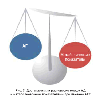 Серьезные нарушения углеводного и липидного обмена, изменение вегетативного фона значительно усложняют подбор антигипертензивной терапии у пациентов с МС, поскольку гипотензивное средство не должно усугублять обменных нарушений. Симпатикотония – важный довод в пользу применения b-блокаторов, но их негативное действие на метаболизм глюкозы лимитирует назначение этой группы лекарственных средств. Кардиологи рекомендуют применение препаратов центрального действия для устранения вегетативного компонента МС, но высокая частота побочных эффектов агонистов α2-адренорецепторов (к примеру, клонидина) ограничивает их использование.
