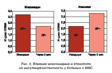 Агонисты имидазолиновых рецепторов способствуют снижению симпатичной гиперактивации и повышают чувствительность периферических тканей к инсулину. По нашим данным, у больных с менопаузальным МС при достижении нормальных уровней АД уже через три месяца терапии моксонидином наблюдались снижение уровней глюкозы и инсулина, повышение чувствительности к нему тканей (в соответствии с индексом HOMA), тогда как на фоне приема атенолола, напротив, происходили отрицательные изменения углеводного обмена и чувствительности тканей к инсулину (рис. 4). Можно сказать, что положительный эффект моксонидина на углеводный и жировой обмен не только позволяет назначать этот препарат при метаболическом синдроме, но и делает это желательным.