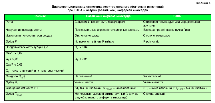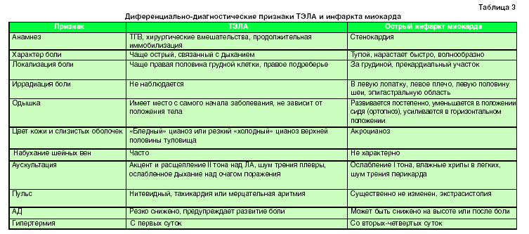 В случае возникновения тяжелой ангинозной боли может возникнуть необходимость проведения дифференциальной диагностики ТЭЛА с острым инфарктом миокарда (табл. 3.). Проводя дифференциальную диагностику в относительно поздние сроки заболевания, следует учитывать, что инфаркт миокарда (в особенности его правожелудочковая локализация) может осложняться ТЭЛА.