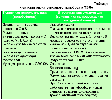 Этиопатогенез ТЭЛА связан с триадой Р. Вирхова: повреждение эндотелия сосудистой стенки, состояние гиперкоагуляции и стаз венозной крови. Факторы риска венозных тромбозов и соответственно ТЭЛА приведены в таблице 1.