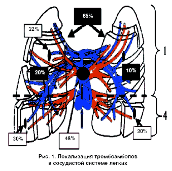 Локализация тромбоэмболов в сосудистой системе легких во многом зависит от их размеров, обычно эмболы задерживаются в местах деления артерий, что вызывает частичную или реже полную окклюзию дистальных ветвей легочной артерии. Характерно поражение легочных артерий обоих легких (65% случаев), которое вызвано повторной эмболизацией малого круга кровообращения и фрагментацией тромба в правом желудочке: в 20% случаев поражается лишь правое легкое, в 10% – только левое, причем нижние доли легких страдают в 4 раза чаще, чем верхние (рис. 1.).