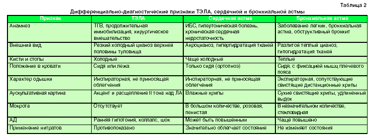 Доминирующие в случае ТЭЛА одышка и удушье могут привести врача к мысли о наличии у больного сердечной или бронхиальной астмы. В случае диагностических трудностей нужно обращать внимание на факторы риска развития тромбоэмболических осложнений, аускультативную картину в легких, не забывать при этом о вероятности развития ТЭЛА. Основные дифференциально-диагностические признаки ТЭЛА, сердечной и бронхиальной астмы приведены в таблице 2..