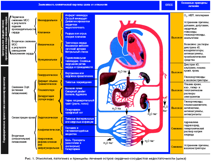 Острая циркуляторная недостаточность является главным синдромом многих видов шока. Однако изменения основных гемодинамических составляющих различны. Например, при гиповолемическом шоке (дефиците ОЦК) функция сердца и ОПСС повышены, а венозный возврат крови в сердце уменьшен.