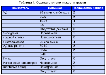 Главными причинами травматического шока являются чрезмерные механическое, термическое и электрическое воздействия. Клиника не всегда соответствует локализации доминирующего повреждения. Наиболее часто первый период осложняется ТЭЛА (жировая эмболия), отеком легких, острой почечной недостаточностью. При изолированных повреждениях тяжелый шок наблюдается в 1 %, при множественных переломах – в 20-25%, а при сочетанных травмах – в 60-65% случаев. Особенность этого шока определяют дополнительные отягощающие факторы: непосредственное разрушение клеток, тканей, сотрясение их, контузия, повреждение жизненно важных органов (иногда многих сразу), большая крово- и плазмопотеря, интенсивная боль, сепсис. Оценка степени тяжести травмы представлена в таблице 1.