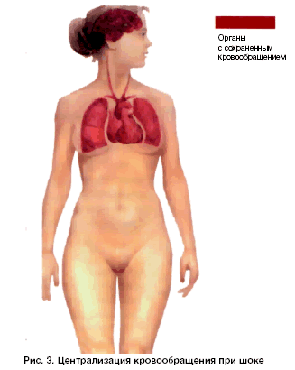 Фаза декомпенсации шока клинически проявляется бледностью кожи, понижением чувствительности, скованностью, тахикардией, снижением артериального и венозного давления, замедлением кровотока, гипоксией, гипотермией, олигоанурией. Однако РО2 в коре больших полушарий и миокарде понижается мало из-за компенсаторной централизации кровообращения, при которой сужение сосудов кожи, почек и зоны чревного нерва способствует перераспределению МОС и длительное время в достаточной степени обеспечивает снабжение О2 и питательными веществами жизненно важных органов, прежде всего мозга и сердца (рис. 3).