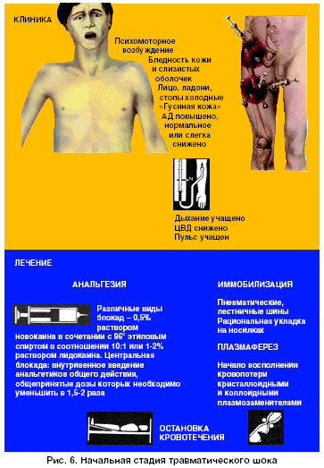 Первая фаза шока кратковременная и клинически не всегда обнаруживается. Обычно она проявляется выраженным речевым и двигательным возбуждением, беспокойством, бледностью кожи, учащением пульса. Сосудистый тонус сохранен. Чаше всего наблюдаются генерализованный артериолоспазм, резкое ускорение метаболизма, значительные нарушения обменных процессов (гиперадреналинемия, гипергликемия, гликозурия и др.) как выражение стрессового повышения тонуса симпатико-адреналовой системы.