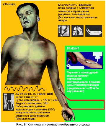 В течении шока выделяют 3 стадии: начальную (рис. 6), обратимую (рис. 7) и необратимую (рис. 8). В начальной стадии состояние больных удовлетворительное, АД повышено, нормальное или слегка снижено (до 85 мм рт. ст.). В стадии обратимого шока состояние больных тяжелое. АД ниже 80 мм рт. ст. , пульс 100-120 в 1 мин, слабого наполнения и напряжения, наблюдаются одышка, жажда, олигурия (менее 40 мл/час), гипотермия (рис. 6). В стадии необратимого шока состояние больного крайне тяжелое (рис. 8).