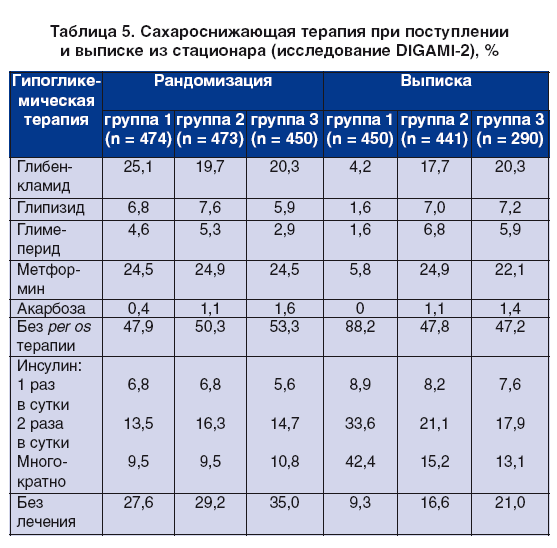 Все больные, включенные в исследование, были рандомизированы на три группы. Больным 1-й и 2-й групп сразу после рандомизации внутривенно вводили инсулиноглюкозную смесь по представленной выше методике. При этом перед врачом ставилась задача как можно быстрее снизить уровень глюкозы крови до 7-10 ммоль/л и удерживать его с помощью внутривенной инфузии не менее 24 часов. Затем внутривенную инфузию прекращали, далее тактика контроля углеводного обмена в этих двух группах больных была различной. В 1-й группе в течение последующих трех месяцев для контроля уровня глюкозы в крови использовали только подкожные многократные инъекции инсулина: короткого действия – перед едой и средней продолжительности действия – в вечернее время. Целевой уровень глюкозы в крови при этом был определен как 5-7 ммоль/л натощак и не более 10 ммоль/л после еды. Во 2-й группе больных после прекращения в/в инфузии инсулина никакая унифицированная тактика контроля уровня глюкозы крови не предусматривалась, ее определял лечащий врач, интенсивность тактики контроля могла варьировать в достаточно широких пределах, как и выбор применяемых лекарственных средств. При этом специальные целевые уровни глюкозы в крови заранее не оговаривались. В 3-й группе больных обязательного внутривенного введения инсулина не применяли. С момента поступления пациента в клинику сахароснижающая терапия строилась исключительно на представлениях лечащих врачей о необходимости приема тех или иных препаратов и интенсивности снижения уровня глюкозы в крови. В результате в 3-й группе внутривенная инсулинотерапия в остром периоде ИМ была проведена у 14% больных, в то время как и в 1-й, и во 2-й группах у 94%. Более подробно сахароснижающая терапия при рандомизации и выписке представлена в таблице 5.