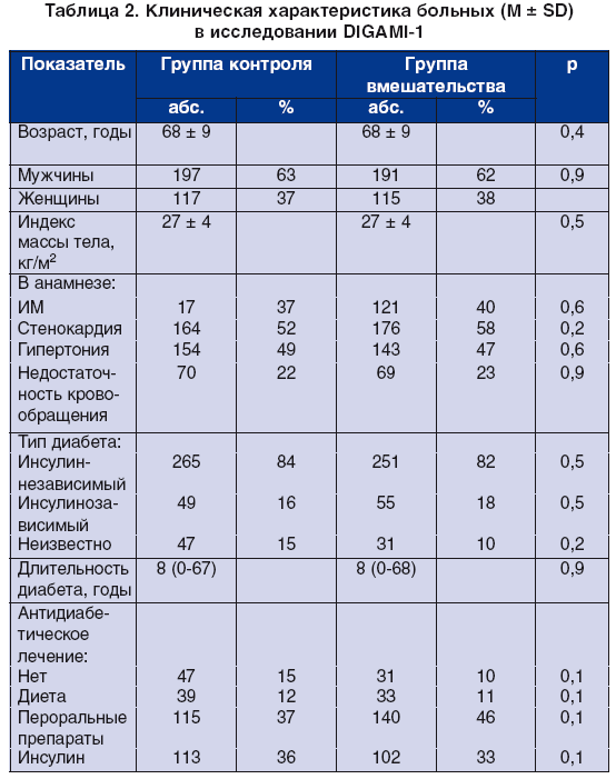 После прекращения инфузии инсулиноглюкозной смеси больные использовали подкожно инъекции инсулина в течение трех месяцев. Больные контрольной группы получали стандартную сахароснижающую терапию, назначаемую дежурным врачом. Проводимая кардиальная терапия отвечала жестким современным критериям и была достаточно унифицированной для обеих групп больных. Тромболизис, β-блокаторы и аспирин применяли как можно раньше при отсутствии противопоказаний. Больные находились под наблюдением в течение года, через 3 и 12 месяцев после рандомизации всех пациентов осмотрели повторно, в дальнейшем за ними наблюдали их семейные врачи. Последняя информация о состоянии больных представлена сотрудниками каждого участвующего в DIGAMI-1 медицинского центра 31 июля 1995 г. Время наблюдения за пациентами составило от 1,6 до 5,6 года, среднее время участия больного в исследовании – 3,4 года, этот показатель не различался по подгруппам больных с разной степенью сердечно-сосудистого риска [21]. Результаты сравнительного анализа исходных клинических показателей групп интенсивного вмешательства и контроля (табл. 2) свидетельствуют о практической идентичности пациентов. Исключая различия в сахароснижающей терапии, больные этих двух групп, с точки зрения получаемого лечения в стационаре и после выписки, значительно не отличались.