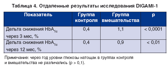 Заключение, сделанное исследователями, содержало утверждение, что инфузия инсулиноглюкозной смеси в сочетании с последующим интенсивным применением подкожных инъекций инсулина при остром ИМ у больных СД улучшает их выживаемость в течение первого года после возникновения очаговых поражений сердца. Абсолютное снижение смертности на 11% означает, что на девять больных, подвергнутых подобной терапии, приходится одна спасенная жизнь.