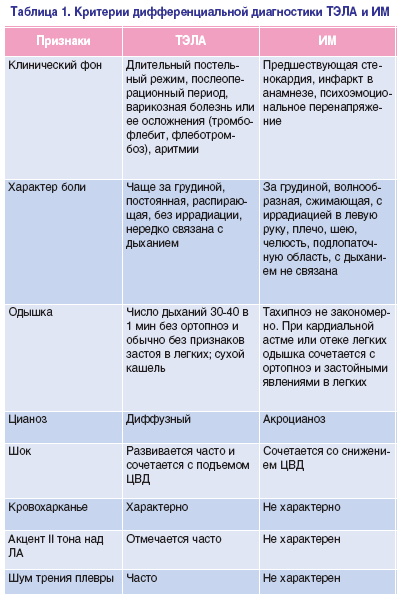Ни один из перечисленных синдромов не является патогномоничным для ТЭЛА, однако при проведении дифференциальной диагностики нужно учитывать, что отсутствие таких симптомов, как одышка, тахикардия, боль в грудной клетке, ставит под сомнение наличие ТЭЛА. Значение этих симптомов значительно возрастает при наличии у пациенток варикозной болезни.