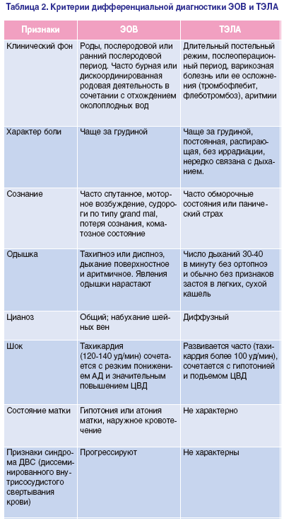• Дифференциальная диагностика эмболии околоплодными водами (ЭОВ) и ТЭЛА должна проводиться с учетом критериев, приведенных в таблице 2.