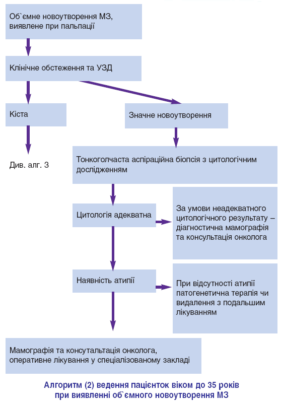 Алгоритм (2) ведення пацієнток віком до 35 років при виявленні об`ємного новоутворення МЗ