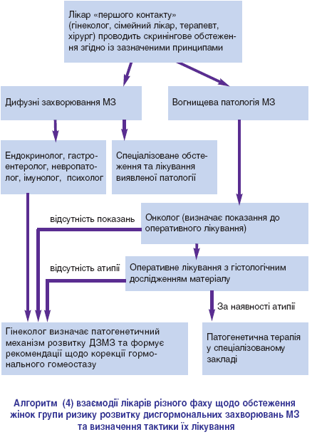 Алгоритм (4) взаємодії лікарів різного фаху щодо обстеження жінок групи ризику розвитку дисгормональних захворювань МЗ та визначення тактики їх лікування