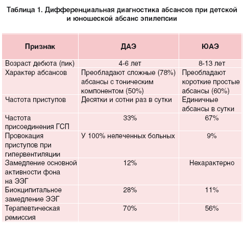 Юношеская абсанс эпилепсия (ЮАЭ) – разновидность идиопатической генерализованной эпилепсии, которая характеризуется основным видом приступов – абсансами (простые абсансы встречаются в 60% случаев), дебютирующими в пубертатном периоде (от 9 до 21 года, в среднем – 12,5 лет) с высокой вероятностью присоединения генерализованных судорожных приступов (в 75% случаев), которые часто провоцируются депривацией сна (табл. 1). Наличие очаговых неврологических симптомов и снижение интеллекта для пациентов с ЮАЭ нехарактерно.