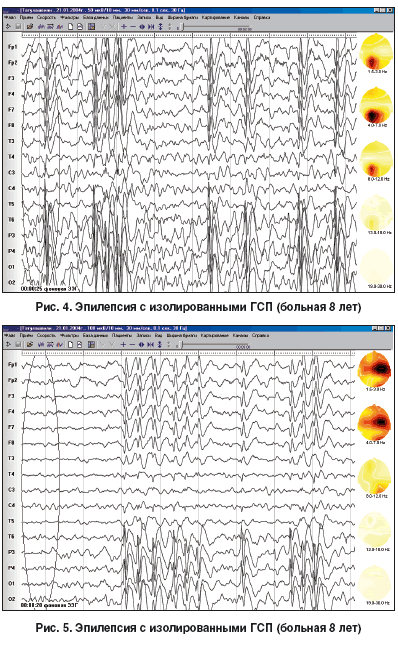 На ЭЭГ отмечается генерализованная эпиактивность в виде пик-волновых комплексов с частотой 3-4 Гц, замедление основной записи нехарактерно, возможны региональные изменения ЭЭГ в виде амплитудной асимметрии эпикомплексов, региональной пик-волновой активности (рис. 4, 5). ЭЭГ-исследование в межприступном периоде у половины больных может быть в пределах нормы. Следует проводить дифференциальную диагностику ИГСП с вторично-генерализованной эпилепсией (табл. 2).