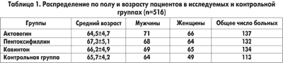 Из 516 пациентов 134 получали Кавинтон (таблетки) по 30 мг/сут, 132 — пентоксифиллин (таблетки) по 400 мг/сут и 137 больных — Актовегин по 6 драже в день. Распределение больных по группам препаратов было случайным и проводилось открытым методом. Длительность курсов лечения составляла 2 месяца. Больные наблюдались в течение 3 лет с проведением трех курсов лечения в год.