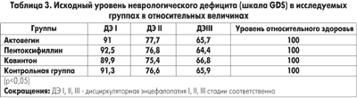 У больных с дисциркуляторной энцефалопатией II стадии наиболее заметным было влияние Кавинтона и пентоксифиллина на стабилизацию течения цереброваскулярной недостаточности (процент больных со стабильным течением ДЭ II равнялся 65,8% и 64,9% соответственно). Актовегин был менее эффективен при лечении этой категории больных, величина данного показателя на фоне его применения была примерно в 1,5 раза меньше. В группе контроля показатель стабильного течения церебральной сосудистой недостаточности составил 5,9%.