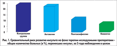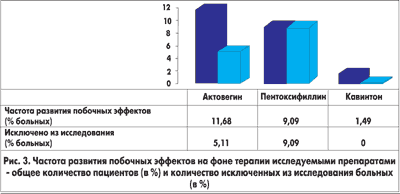 У ряда больных на фоне терапии были отмечены побочные эффекты. При лечении Актовегином у 16 (11,68%) пациентов возникли аллергические реакции различной степени выраженности, из них — 7 (5,11%) больных были исключены из исследования. У получавших пентоксифиллин побочные эффекты и осложнения на лечение возникли у 12 (9,09%) пациентов (у 5 — 3,79% пациентов они проявлялись в возникновении и учащении приступов аритмии и у 7 — 5,3% пациентов возникали эпизоды значительного снижения артериального давления либо его колебания). У всех этих больных терапию также пришлось прекратить. В группе больных, принимающих Кавинтон, процент побочных эффектов составил 1,49% из-за возникновения головной боли (1 пациент) и аллергической реакции (1 пациент). Вместе с тем, степень выраженности и субъективная значимость указанных явлений у данных больных позволила им продолжить лечение. Сводные данные отражены на рисунке 3.