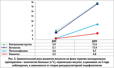 Применение Кавинтона и пентоксифиллина снижало риск возникновения инсульта по сравнению с контрольной группой приблизительно в 2 раза. Лечение Актовегином не дало статистически достоверного различия по этому показателю по сравнению с группой контроля (5,1% и 5,9% у больных с ДЭ II и 17,4% и 17,6% у пациентов с ДЭ III соответственно). Данные представлены на рисунках 1 и 2.
