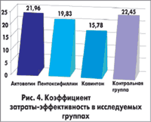 Из представленных данных видно, что коэффициент «затраты-эффективность» (рис. 4) — наименьший в группе больных, получавших Кавинтон. Это обусловлено высокой эффективностью препарата, незначительным процентом побочных эффектов и осложнений при лечении, а также его хорошей переносимостью (в том числе и у пациентов старших возрастных групп) и сравнительно небольшой стоимостью Кавинтона.