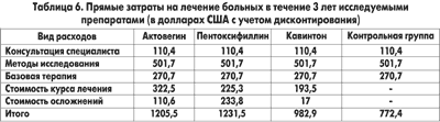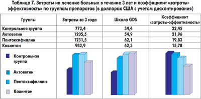 Наибольшая общая стоимость лечения и диагностики по исследуемым группам оказалась при лечении пентоксифиллином и составила 1231,5 у.е., а также при лечении актовегином — 1205,5 у.е., что значительно отличалось от общей стоимости лечения Кавинтоном (982,9 у.е.). Разница в стоимости лечения по группам препаратов формировалась за счет стоимости побочных эффектов (в первую очередь на фоне применения пентоксифиллина) и стоимости самого препарата (что особенно значимо для Актовегина).