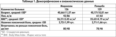 Всего в исследование было вовлечено 255 больных, данные которых были пригодны для оценки эффективности. Между группами, получавшими Мидокалм и плацебо, не было достоверных различий в возрасте и в индексе массы тела, сходными были также анамнестические данные о длительности поясничной боли и частоте ранее возникавших случаев патологии (табл. 1).