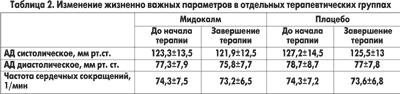 Во время исследования в состоянии больных в 36 случаях фиксировались дополнительные изменения, в частоте, характере и тяжести которых различий между группами, принимавшими Мидокалм и плацебо, выявлено не было. По жизненно важным параметрам (артериальное давление и частота сердечных сокращений) в двух группах были зарегистрированы сходные значения. Таким образом, было показано, что терапия Мидокалмом не влияла ни на артериальное давление, ни на частоту сердечных сокращений (табл. 2).